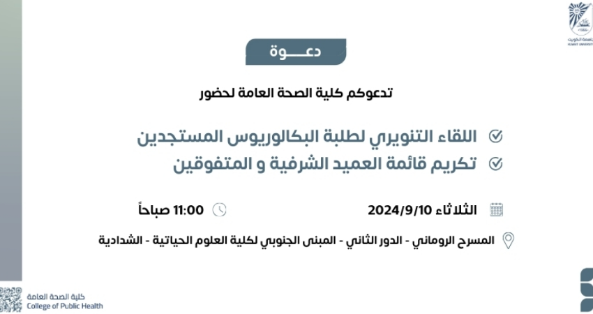 تنظم كلية الصحة العامة بمركز العلوم الطبية في جامعة الكويت اللقاء التنويري للطلبة المستجدين ببرنامج بكالوريوس العلوم في الصحة و دراسات المجتمع ، و ذلك يوم الثلاثاء المقبل الموافق 10 سبتمبر 2024 الساعة 11 صباحاً، في المسرح الروماني في الدور الثاني بالمبنى الجنوبي لكلية العلوم الحياتية في مدينة صباح السالم الجامعية بمنطقة الشدادية
